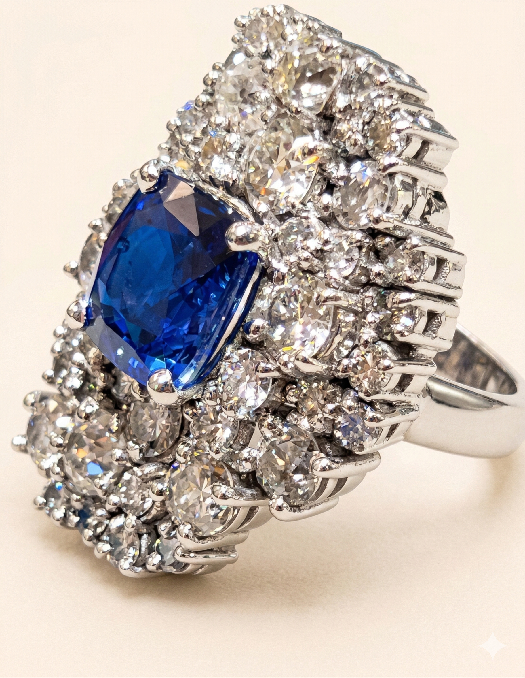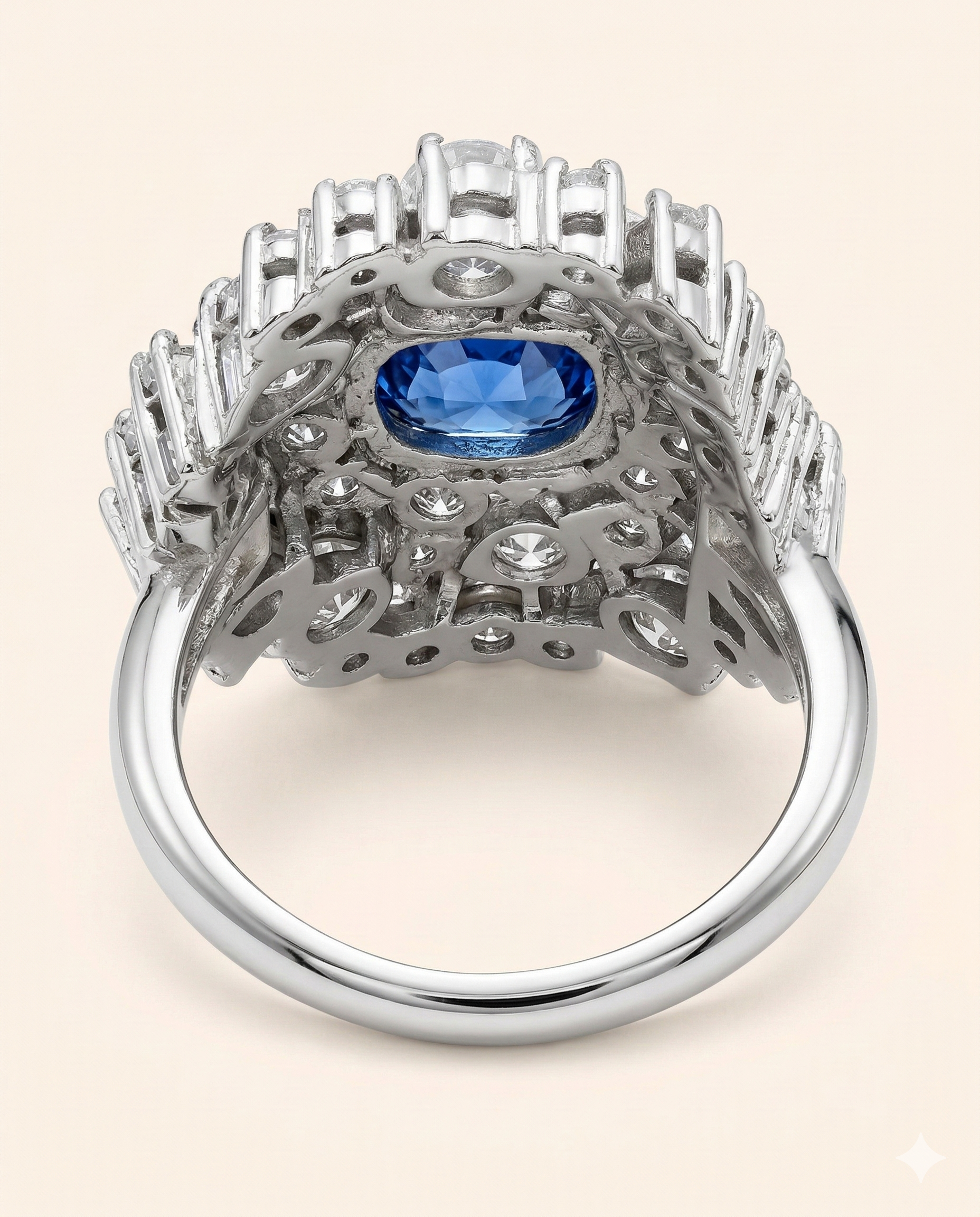 Cette bague d’exception incarne l’élégance intemporelle de la haute joaillerie. Au centre de la création, un saphir bleu profond attire immédiatement le regard par son éclat et la richesse de sa couleur.